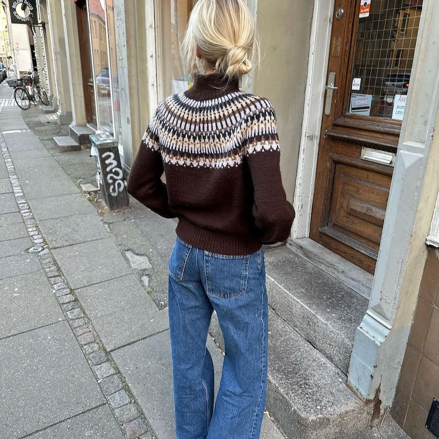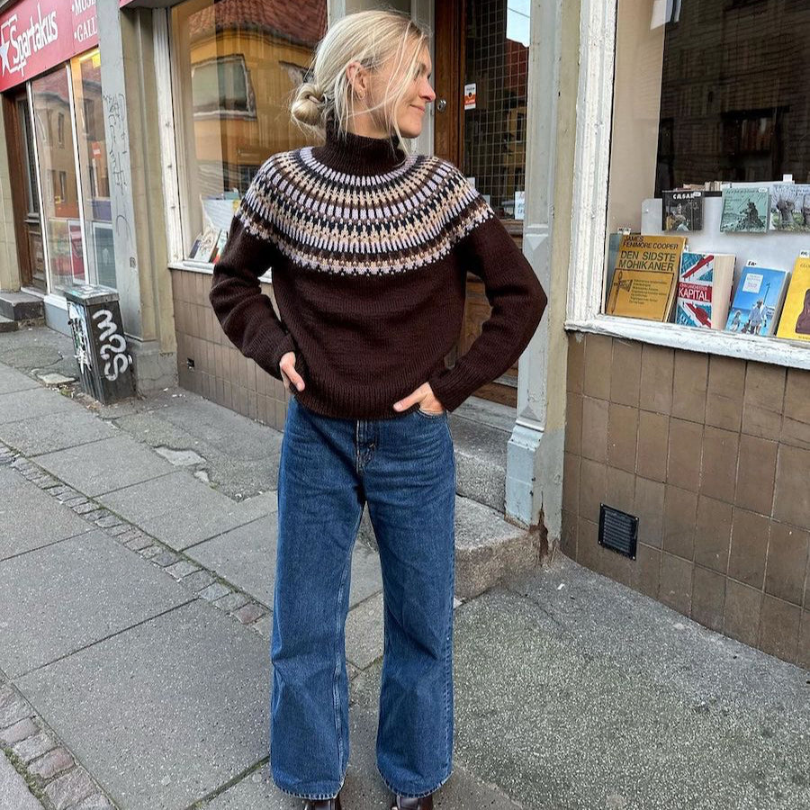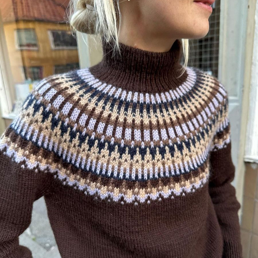 Den brune Celeste Sweater er strikket i Peer Gynt fra Sandnes Garn i farverne Cacao nibs [3091] (bundfarve), Perfect purple [5012] (mønsterfarve 1), Muskat melange [3070] (mønsterfarve 2), Night sky [5591] (mønsterfarve 3) og Shell melange [2710] (mønsterfarve 4).