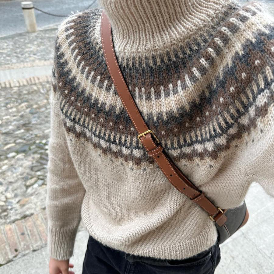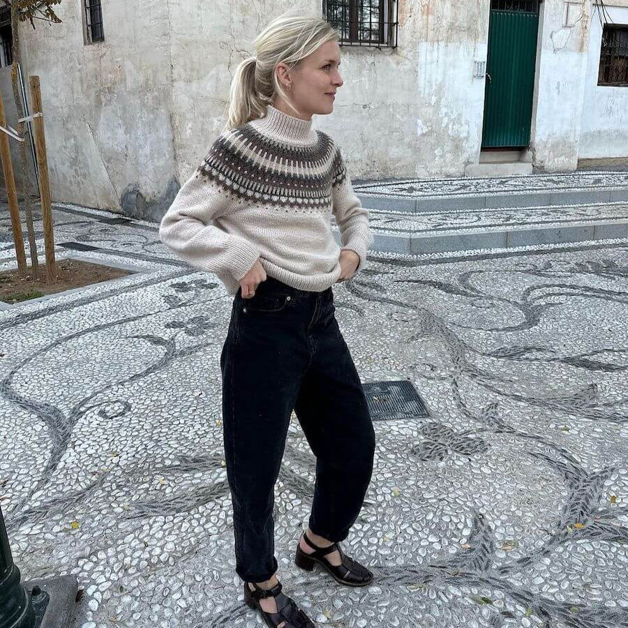 Den lyse Celeste Sweater er strikket i Peer Gynt fra Sandnes Garn i farverne Almond [2511] (bundfarve), Shell melange [2710] (mønsterfarve 1), Mellombrun melert [2652] (mønsterfarve 2), Charcoal melange [1065] (mønsterfarve 3) og Muskat melange [3070] (mønsterfarve 4).