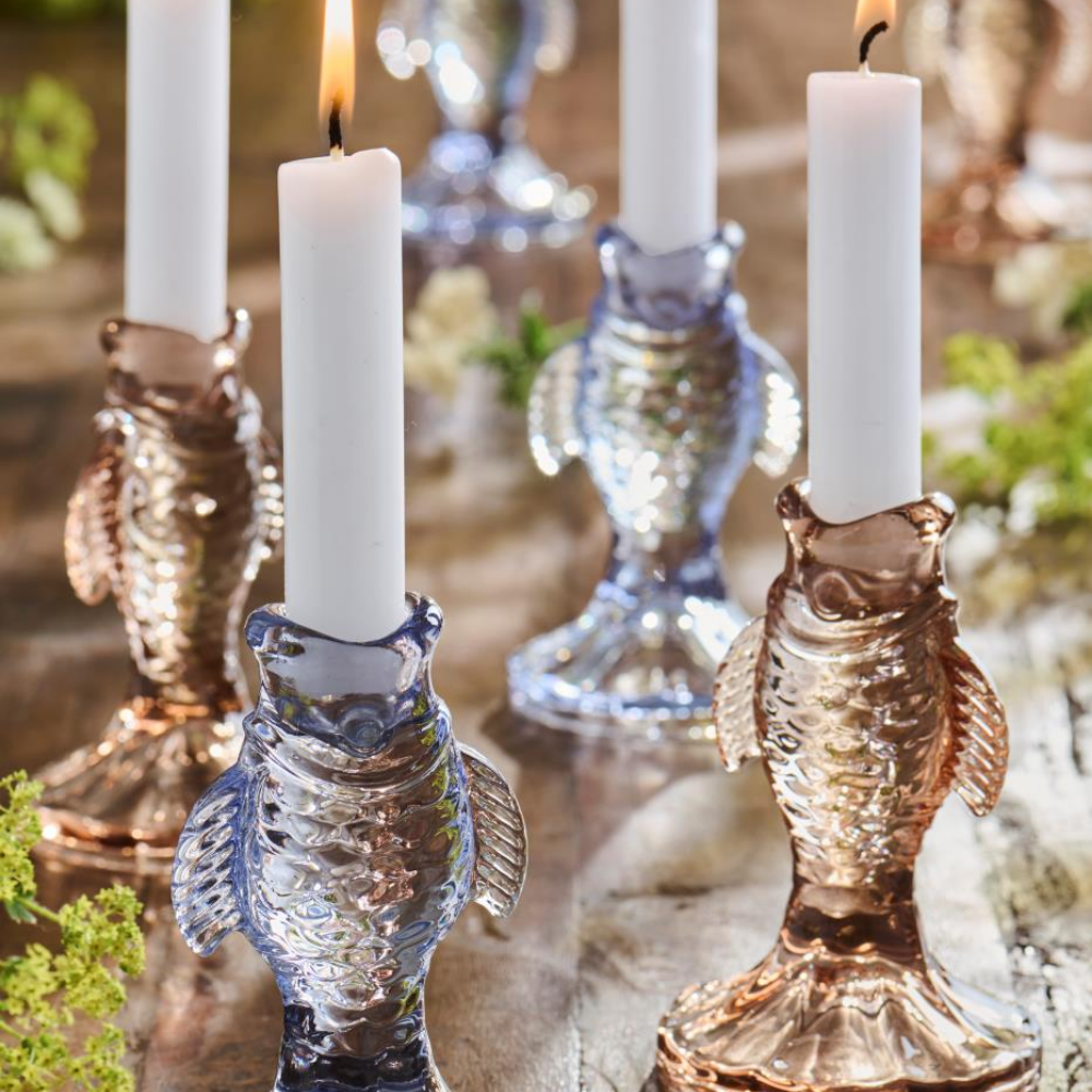 En lysestage med maritim charme. De små fisk i farvet glas kombinerer legende design med dekorativ elegance og spreder hyggeligt lys, uanset hvor de placeres. Perfekt til at give hjemmet et strejf af havets energi.
