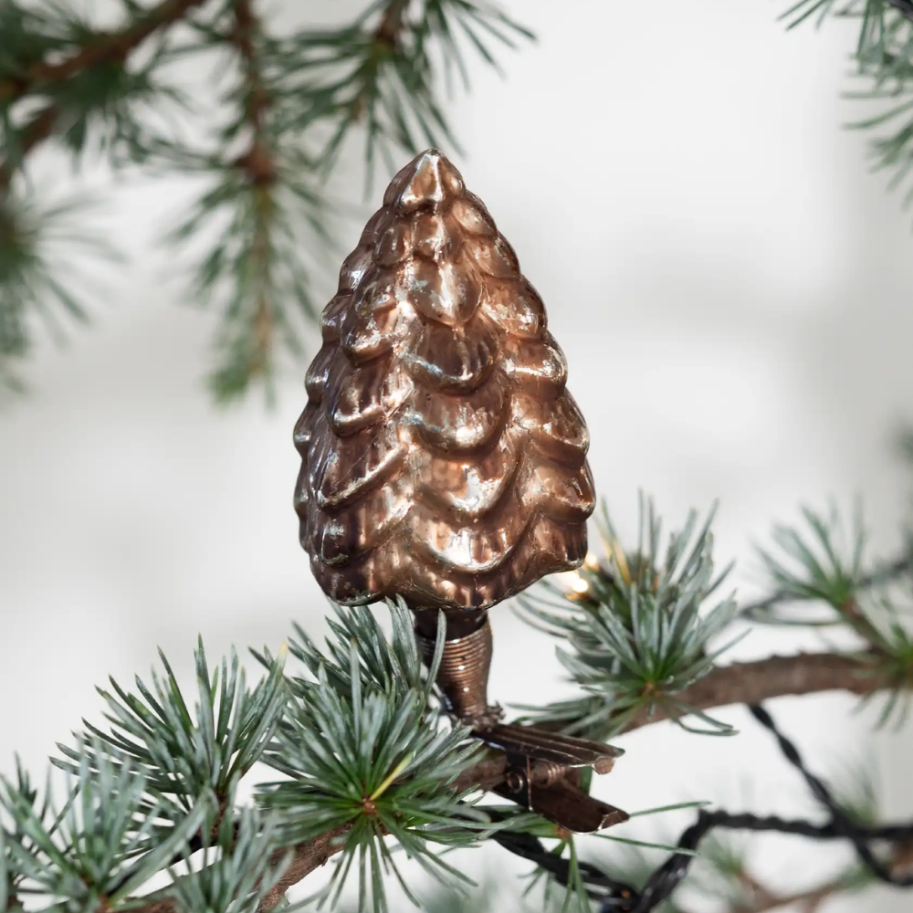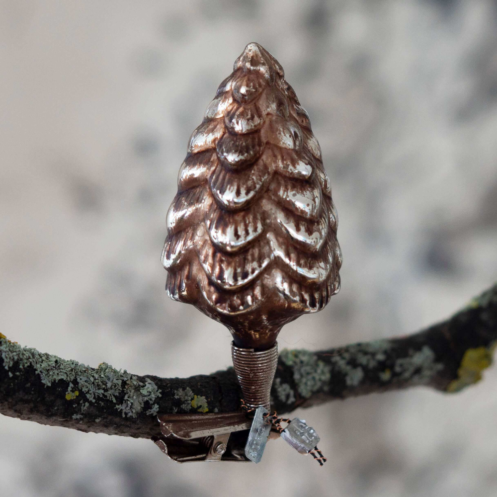 Et lille, men dybt fortryllende juletræ af glas på en metalklemme, der glimter blødt i naturens skoves blide nuancer. Det er en miniatureskat, lille, men rummer i sine skrøbelige grene et ubegrænset univers af nostalgisk julevidunder, hvis essens nænsomt er plukket fra en ægte tysk antik fra 1920'erne.