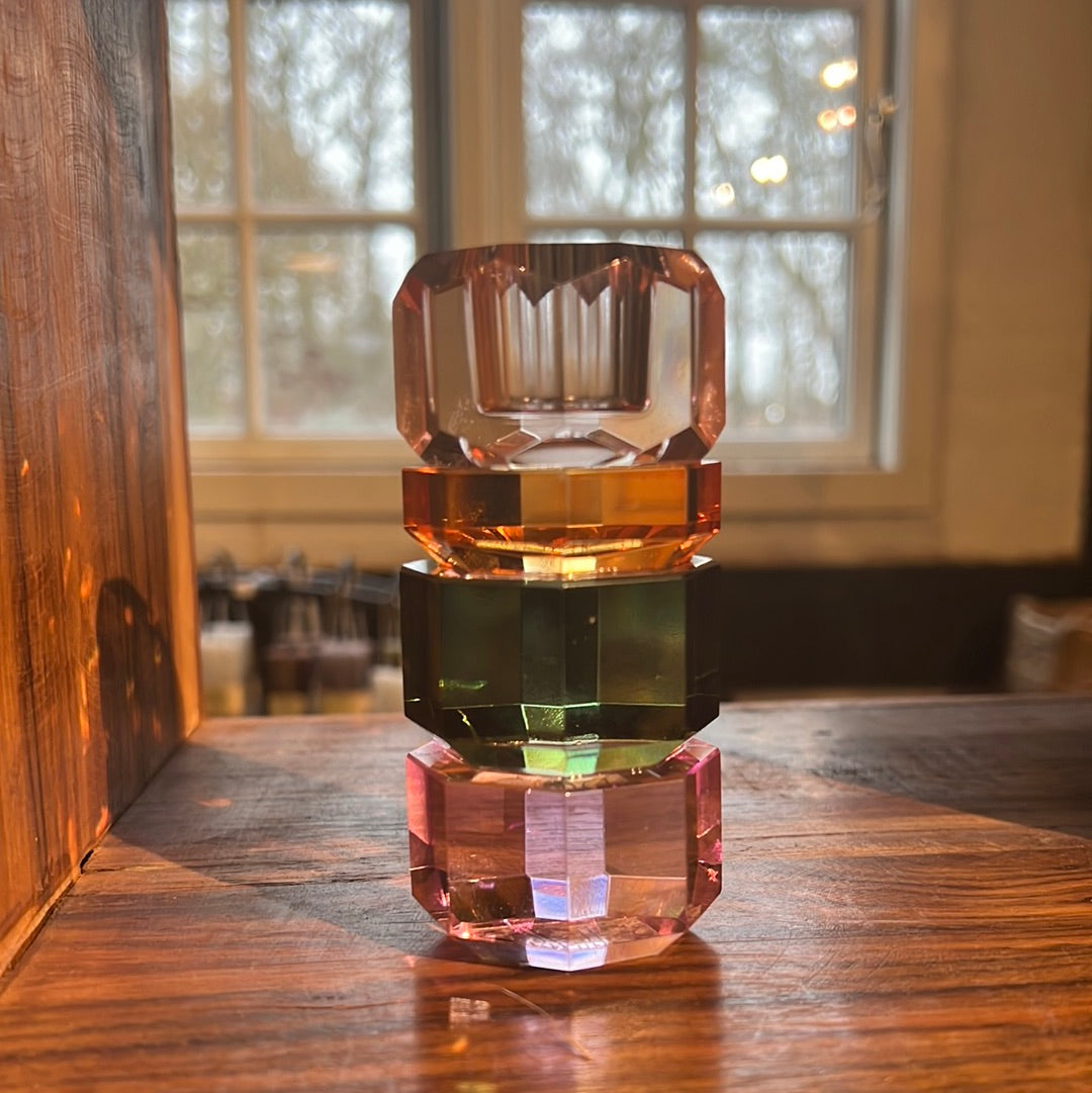 Skab din egen unikke opstilling ved at kombinere krystal stager i forskellige farver og størrelser. Der kan anvendes almindelige stearinlys i lysestagen.