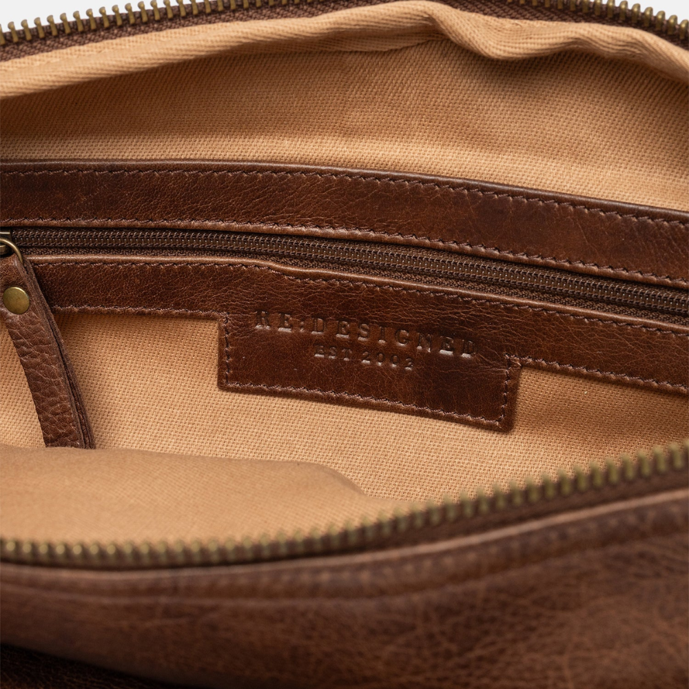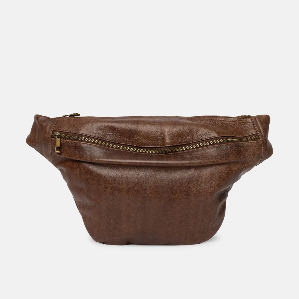 Stor bæltetaske med et stort rum, der lukkes med lynlås, og en mindre lynlåslomme foran. Justerbar rem. Denne læderkvalitet bliver særligt smuk med tiden, da tasken skaber en naturlig patina i det rå læder, når det bruges. Dette læder giver hver taske et unikt udtryk.