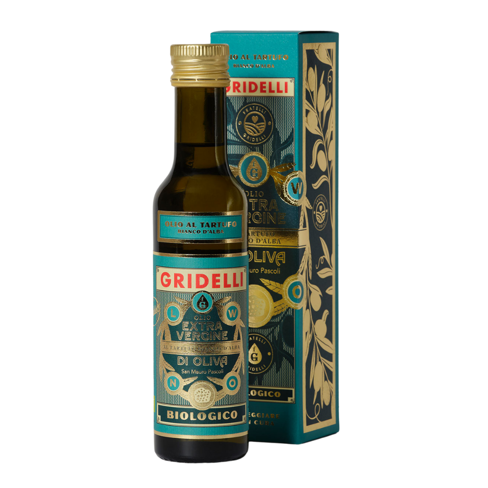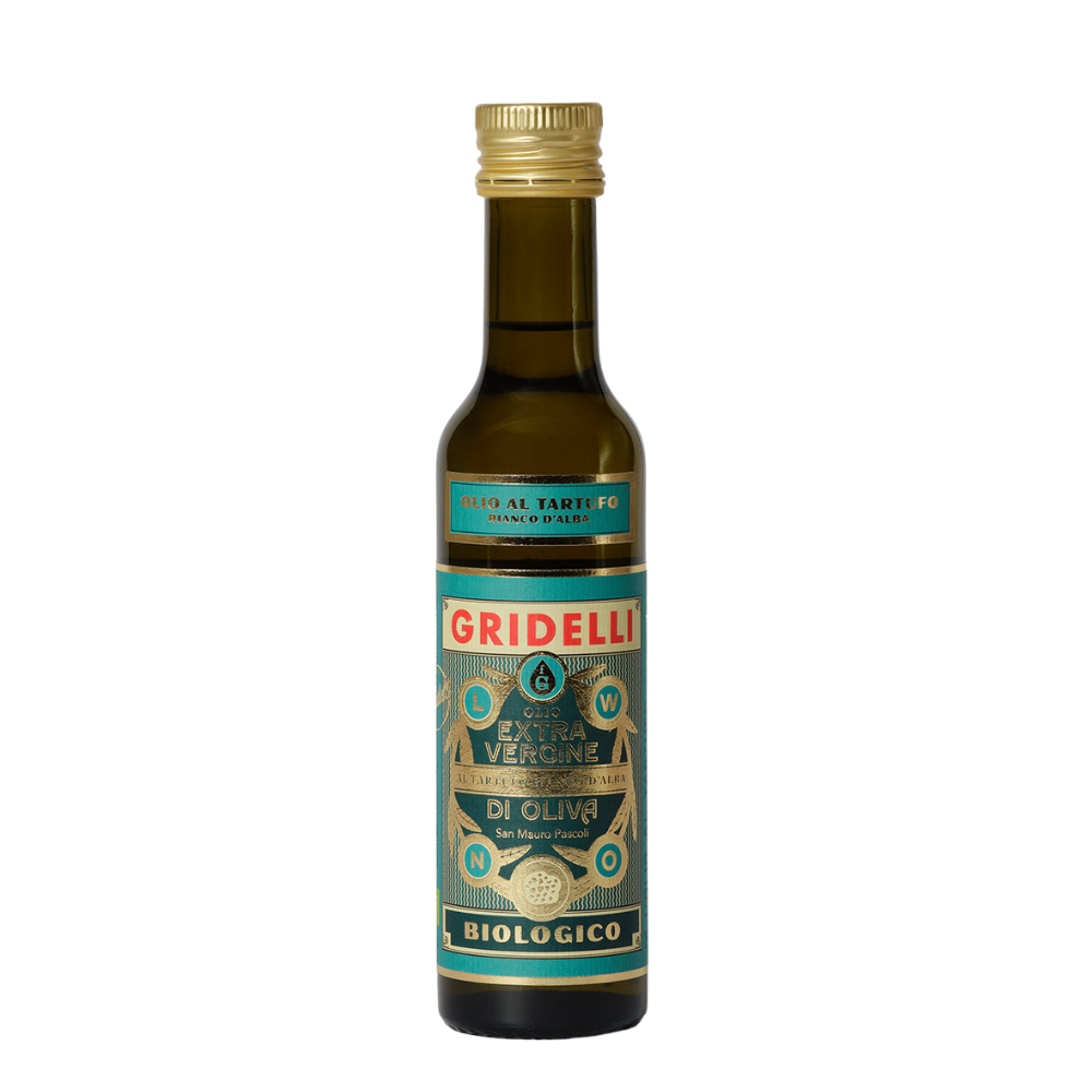 Økologisk olivenolie smagt til med naturlige økologiske aromaer af hvid trøffel fra Alba. Olivenolien er af typen ekstra jomfru og er lavet af oliventypen Correggiolo. Olien har en klar og behagelig note af trøffel og er perfekt til at dryppe over risotto eller en velsmagende pasta med svampe og salsiccia.