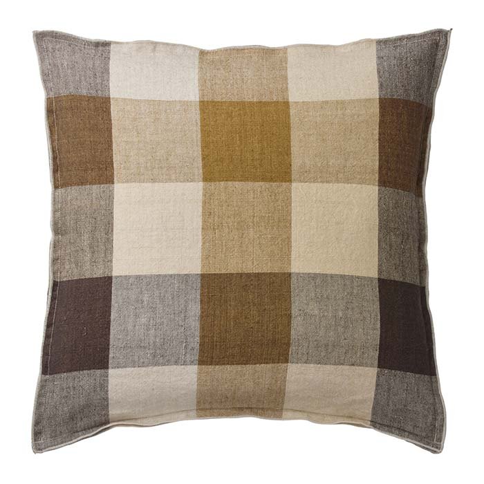 Den ternede pude passer rigtig godt sammen med både de ensfarvede hørpuder men også med velourpuderne. Naturlige farver og materiale.