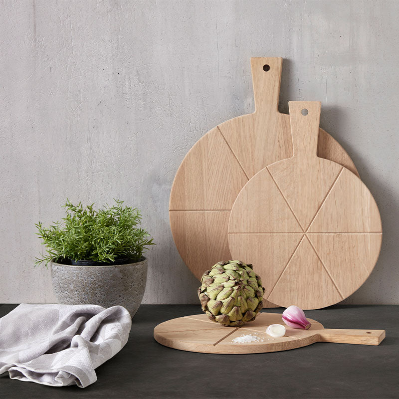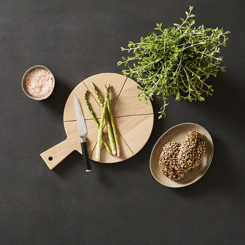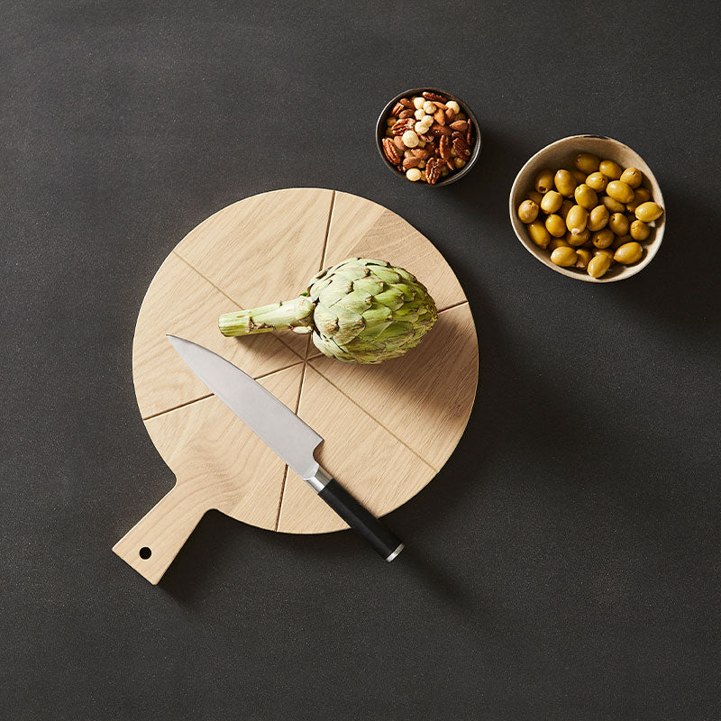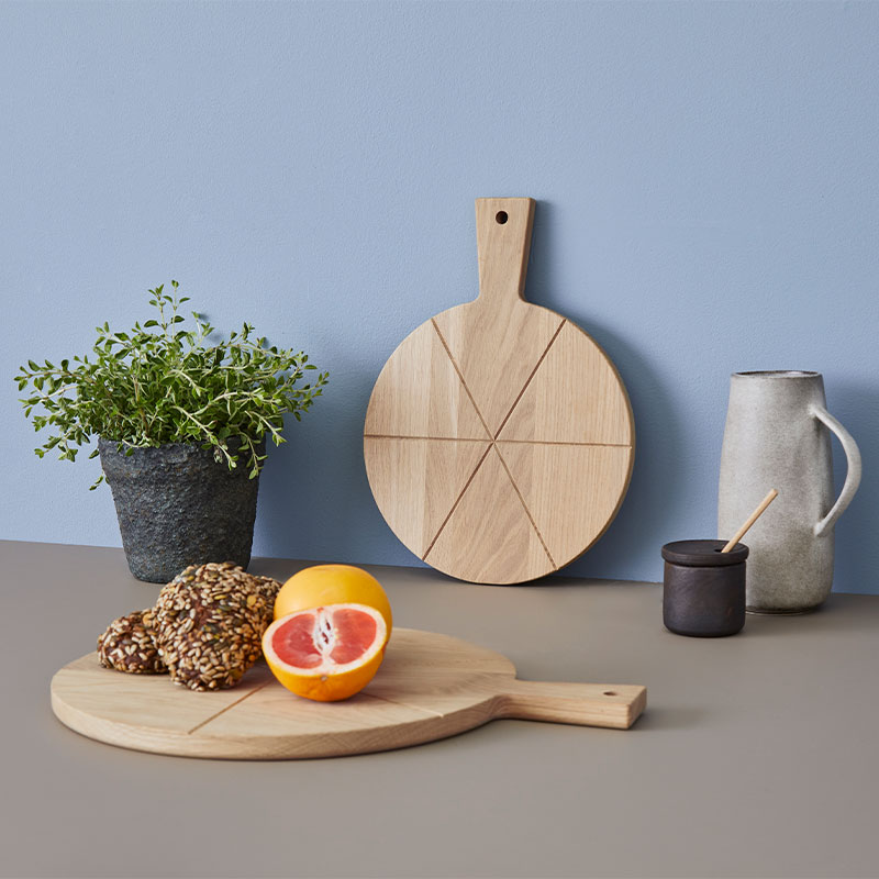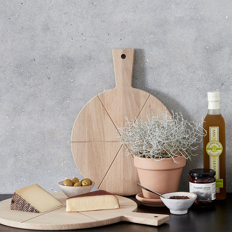 Tapas boardet fra Andersen har en fin form, som er perfekt til servering af fx pizza eller tapas. Brættet er rundt, men har en pudsning for enden, så det nemt kan stå på køkkenbordet og hvile op ad væggen – uden at trille rundt. Det praktiske håndtag er en anden god detalje, som gør tapas boardet let at håndtere ved servering.