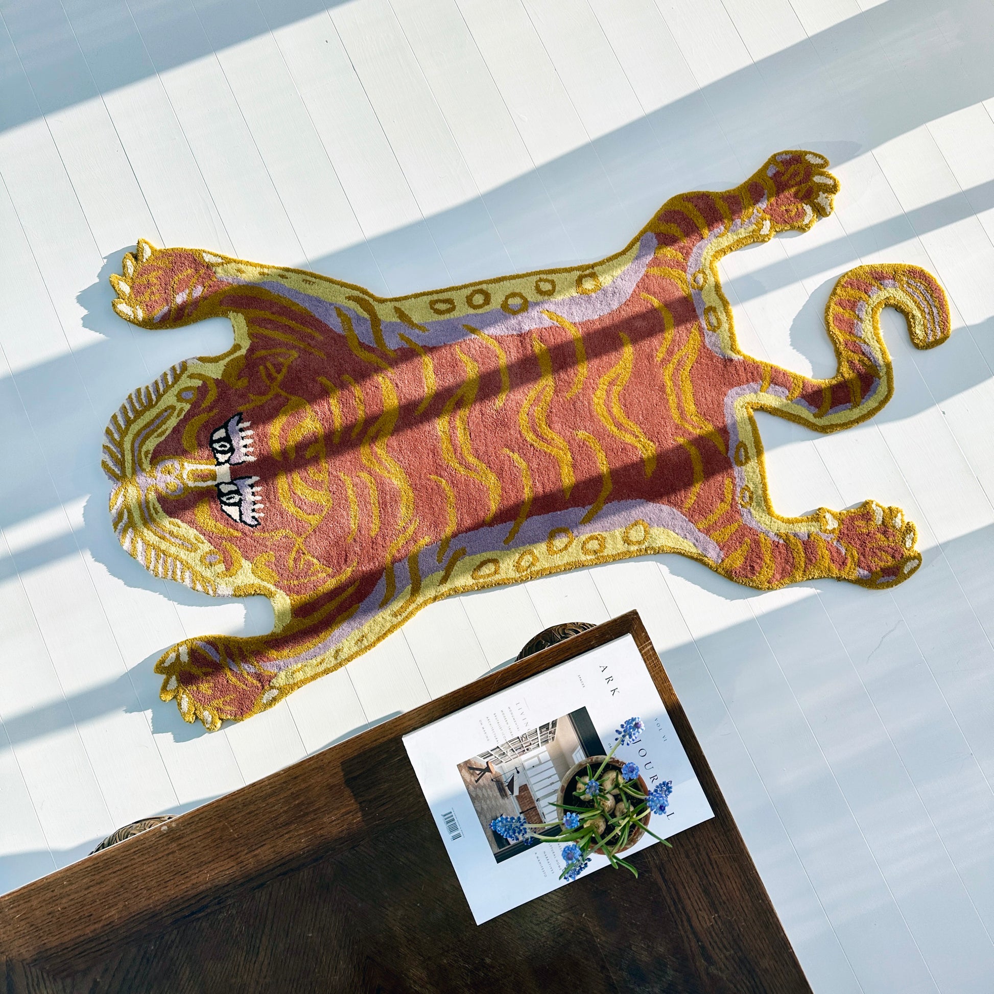 Hvert tigertæppe har sine egne karakteristika på grund af den enkelte vævers 'signatur' i håndværket. Uldkvaliteten giver holdbare tæpper, der føles lune og behagelige, når du går på dem.