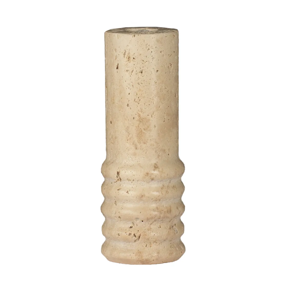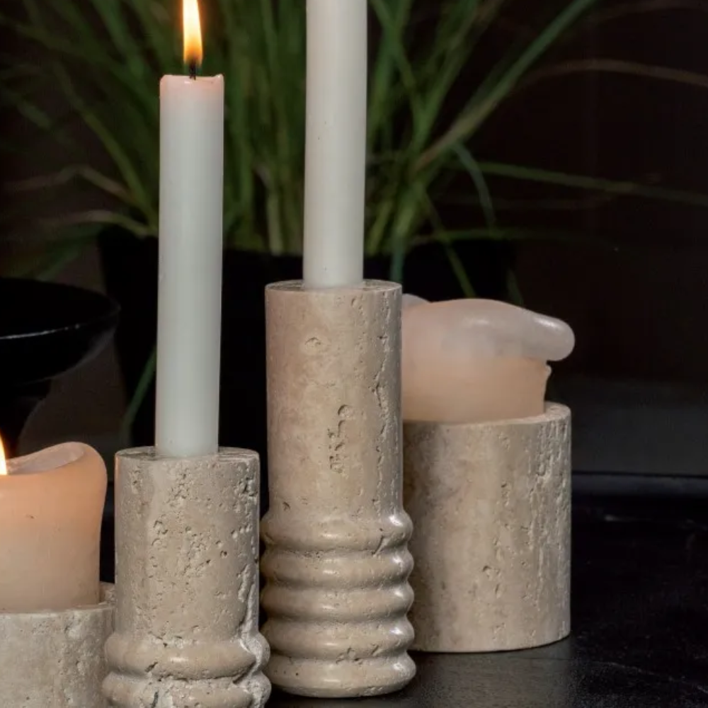 Lysestage i travertinmarmor. Den porøse travertinmarmor har smukke nuancer fra hvid og cremefarvet til lys rust og forskellige nuancer af valnøddebrun, gyldengul og sølvgrå.