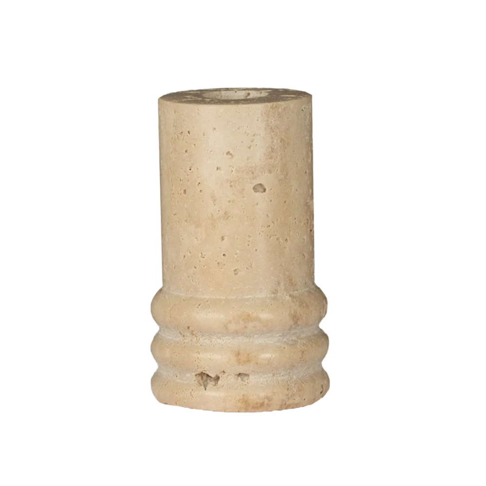 Lysestage i travertinmarmor. Den porøse travertinmarmor har smukke nuancer fra hvid og cremefarvet til lys rust og forskellige nuancer af valnøddebrun, gyldengul og sølvgrå.