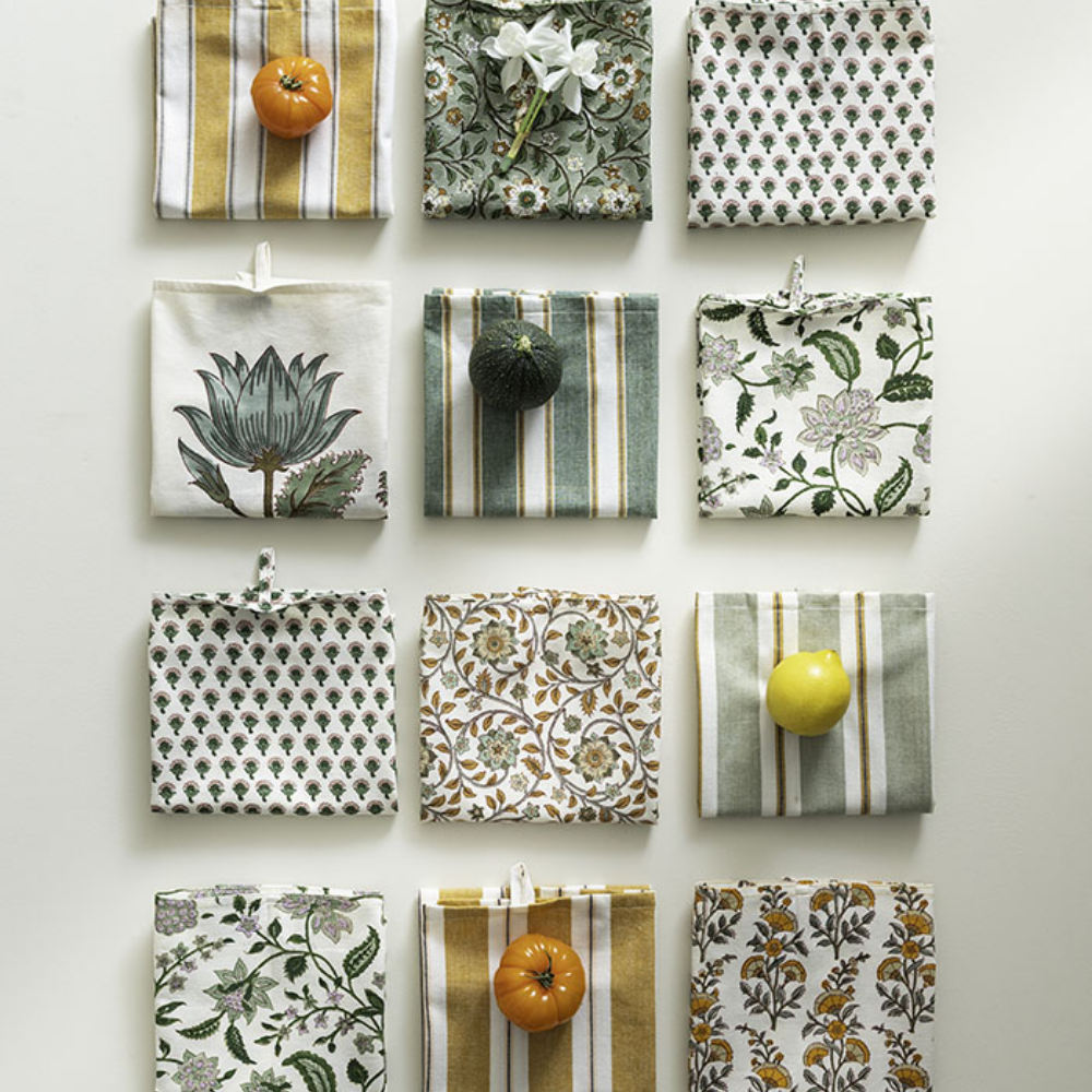 Viskestykkerne er fremstillet med indfarvet garn, hvilket betyder, at striberne er vævet ind i stoffet. Vi håber at det smukke viskestykke vil skabe glæde i dit køkken.