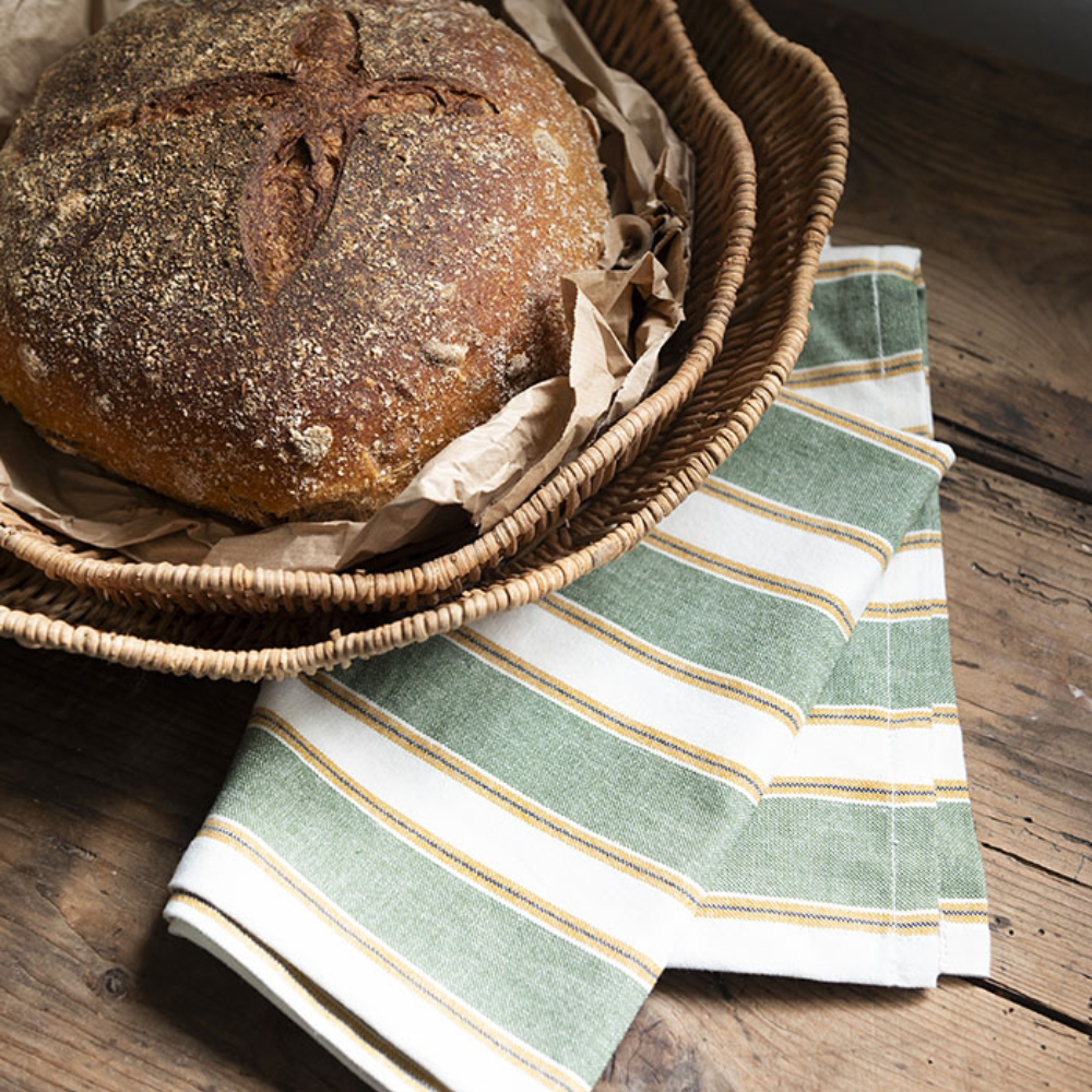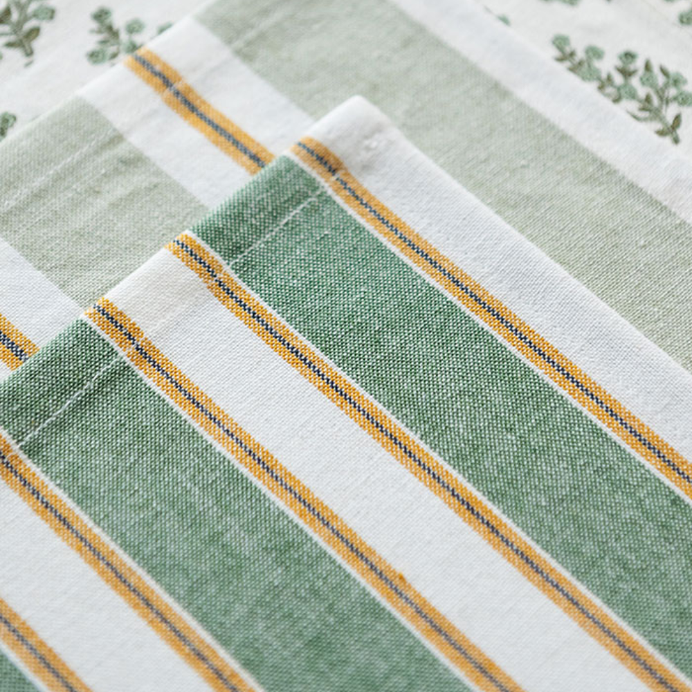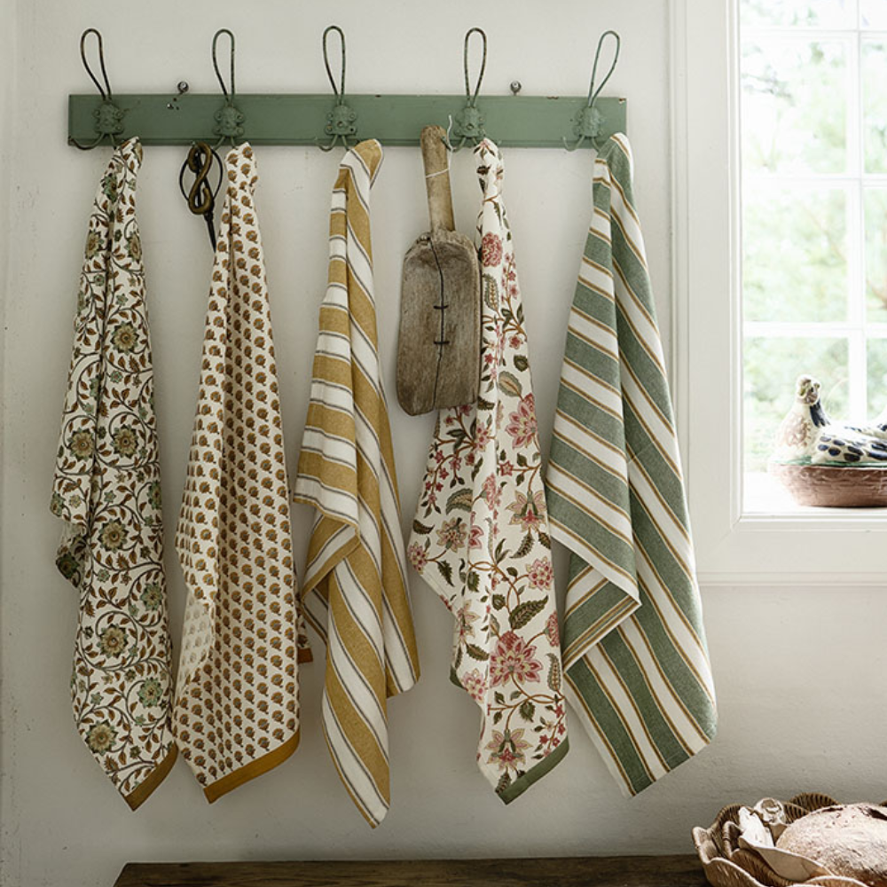 Viskestykkerne er fremstillet med indfarvet garn, hvilket betyder, at striberne er vævet ind i stoffet. Vi håber at det smukke viskestykke vil skabe glæde i dit køkken.