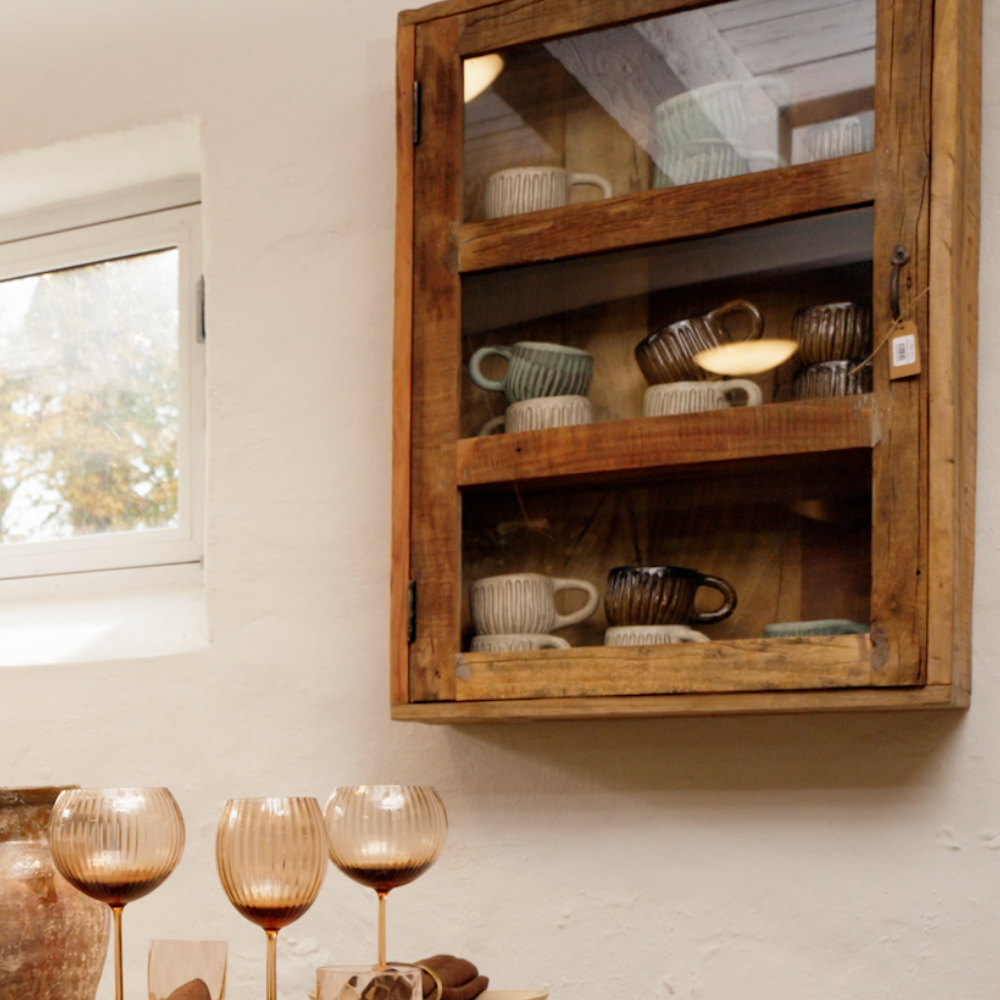 Vitrineskabet er lavet af gammelt træ fra Indien. Så hver enkelt vitrineskab har sin egen charme og ikke to er ens.