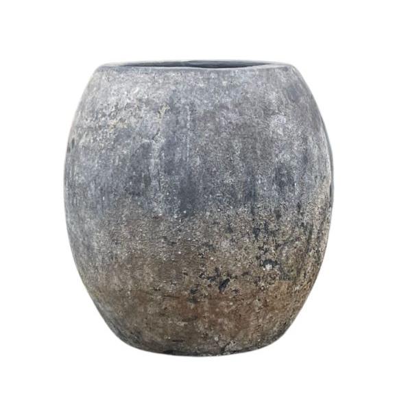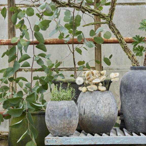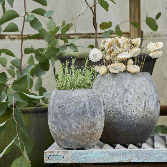 Denne krukke i patineret terracotta er fin og enkel at lave en dekoration i - prøv med et par husløg. Husløg passer så fint til den sort patinerede farve.